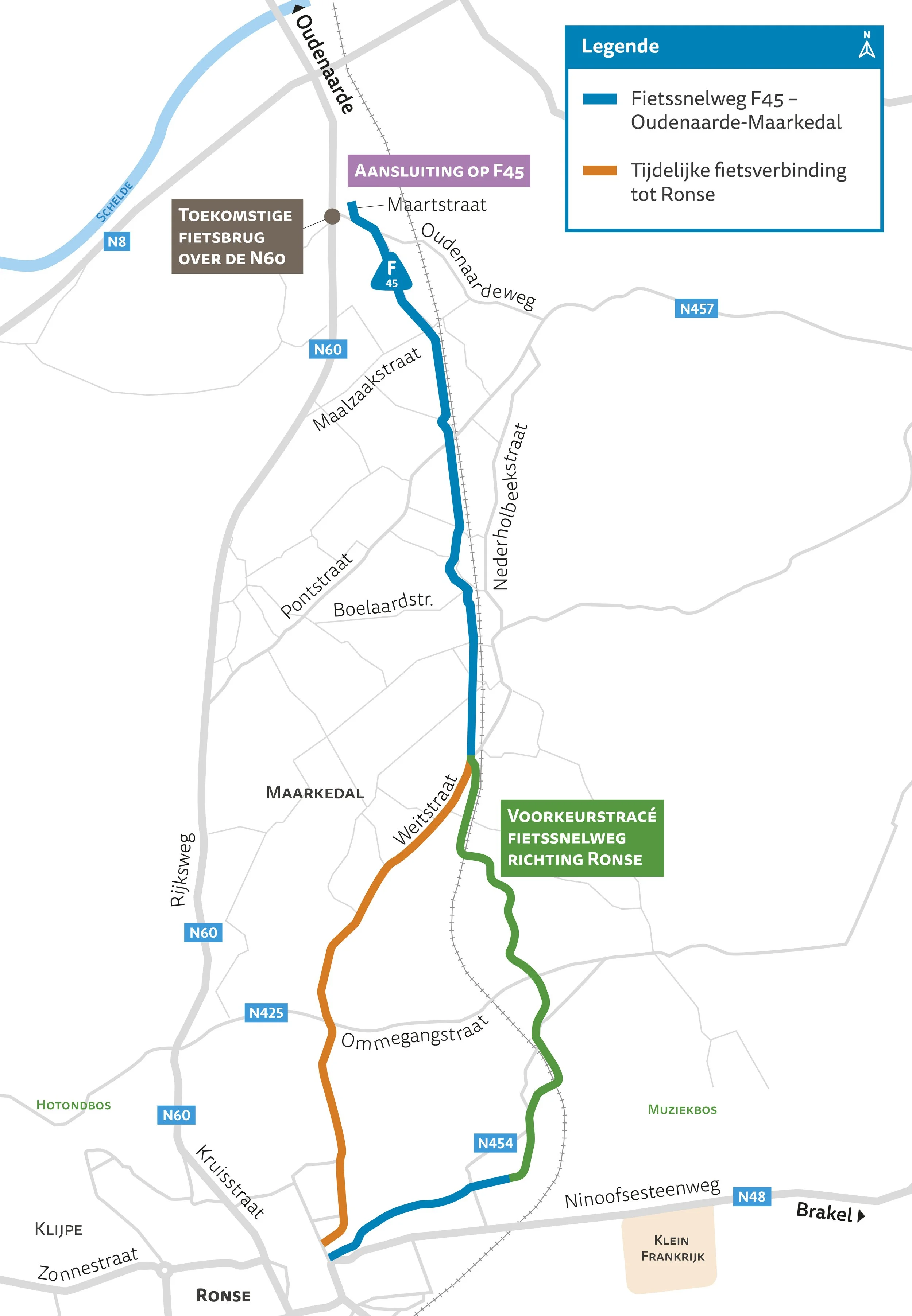 Fietsers kunnen nu al gebruik maken van de F45 van Oudenaarde tot Maarkedal en hun weg tot in het centrum van Ronse vervolgen via de Weitstraat en Hogerlucht.